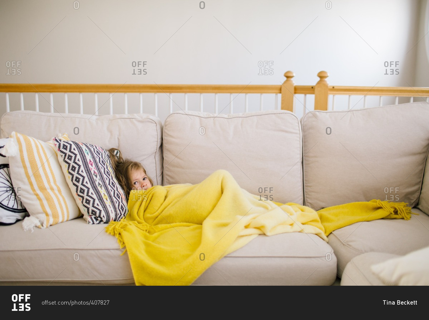 Sick little girl resting on a couch with yellow blanket